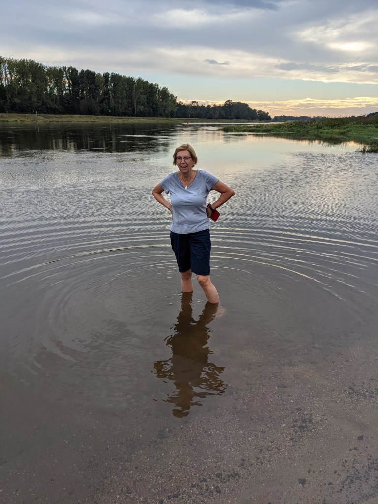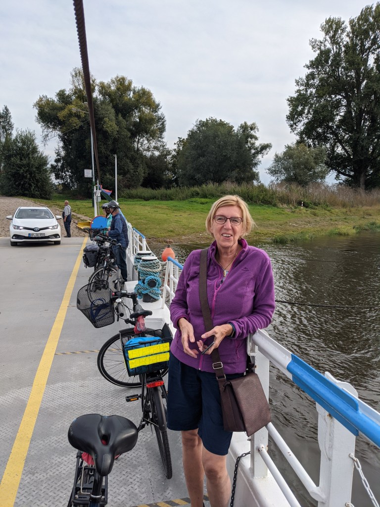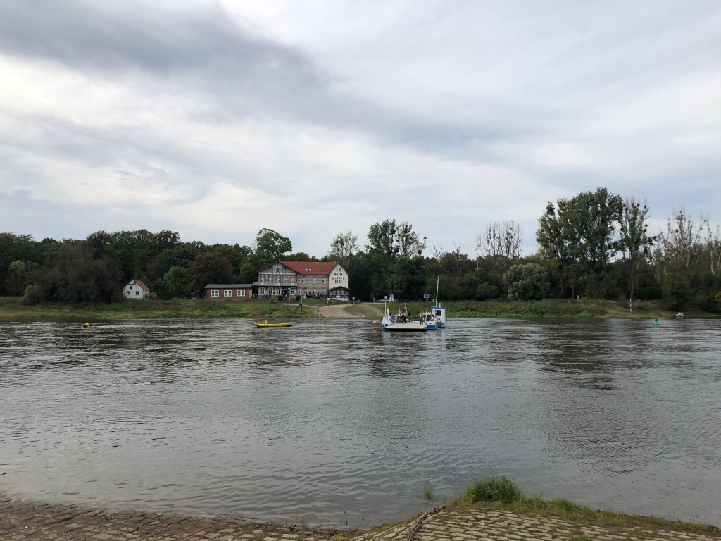 Nachdem wir wieder unten waren, belohnten wir uns mit einem sensationellen Eisbecher (leider ohne Foto). Danach ging es mit dem Fahrrad Richtung Elbe. Dort nutzten wir spontan eine Gier-Fähre, um auf die andere Seite zu gelangen.