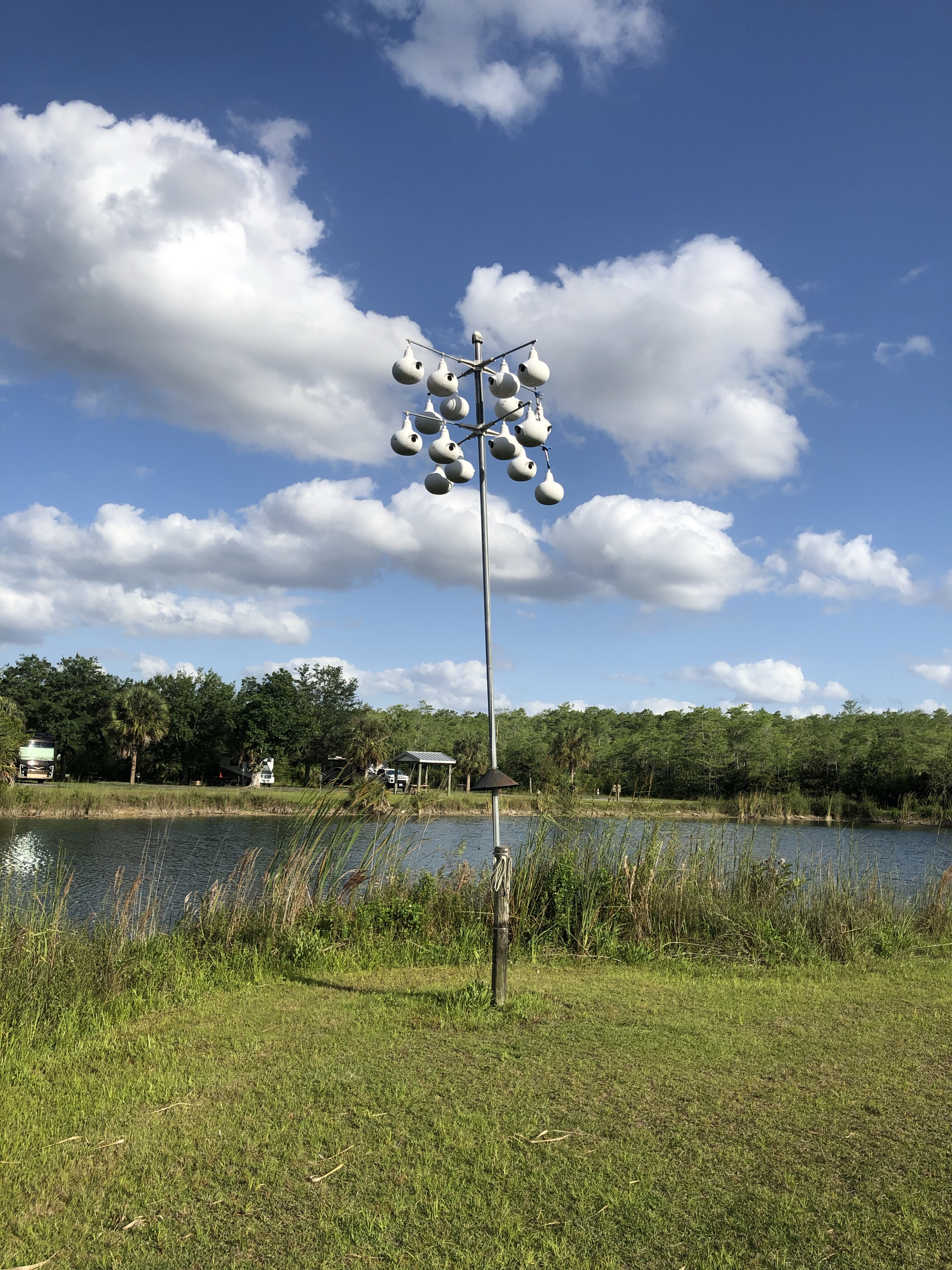 Wir standen zum ersten Mal auf einem sog. State Campground, mit weniger Comfort, dafür aber umso schöner. Was wie eine futuristische Lampe aussieht, entpuppte sich als Vogelhäuschen. Schwimmen war natürlich tabu! Denn im Teich sollten angeblich Alligatoren leben, gesehen haben wir allerdings keinen.