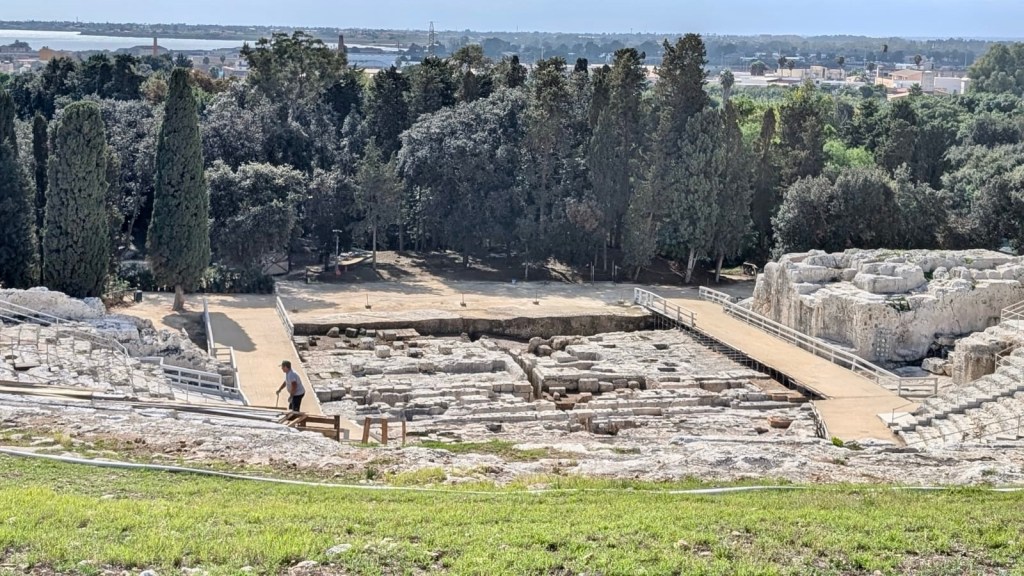 Heute wollten wir uns eigentlich die Ausgrabungen anschauen, aber ich hatte mir den Magen verdorben. Dieter musste also alleine los. Zu sehen gab es ein riesiges römisches Amphitheater, das teils in den Fels gehauen ist. Das griechische Theater (Teatro Greco), dessen Stufen ebenfalls in Stein geschlagen wurden, bot über 15.000 Zuschauern Platz. Wo im 5. Jh. v. Chr. die ersten Komödien Europas aufgeführt wurden, wird heute antikes Sommertheater gezeigt. Highlight des uralten Steinbruchs ist das Ohr des Dionysos, eine 65 m lange, bis 23 hohe Grotte, die von Sklaven und Kriegsgefangenen aus dem Stein geschlagen wurde. Sie geht tief in den Berg hinein und ist berühmt für ihre Akustik.