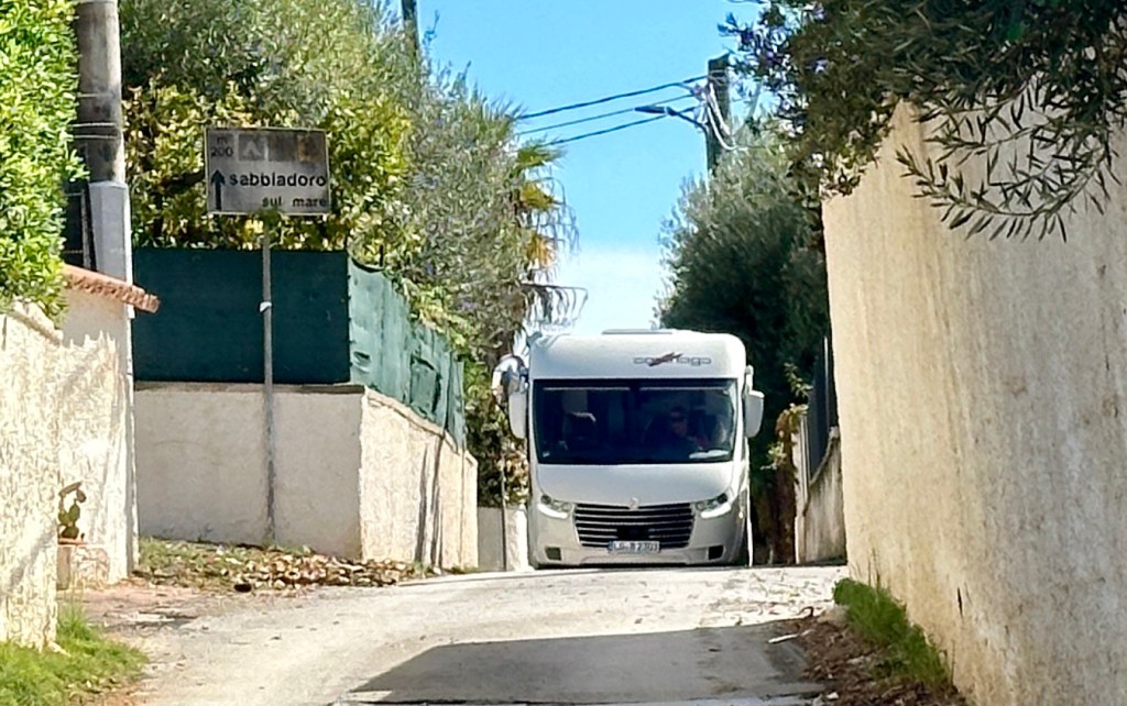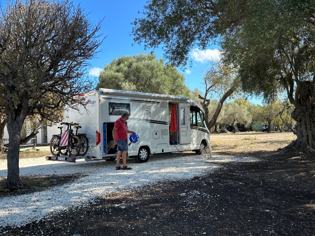 Was in Catania noch recht einfach ging, nämlich rückwärts aus dem Stellplatz raus und langsam auf die Straße, entpuppte sich auf dem Weg zum Campingplatz Sabbiadoro in Avola als echte Herausforderung. Das war bereits in den Rezensionen auf Google zu lesen. Die Zufahrtstraße war so schmal, dass wir gerade so durch passten. Gegenverkehr hätte es nicht geben dürfen. An manchen Stellen hätte weder ein Fußgänger noch ein Fahrrad vorbei gepasst.