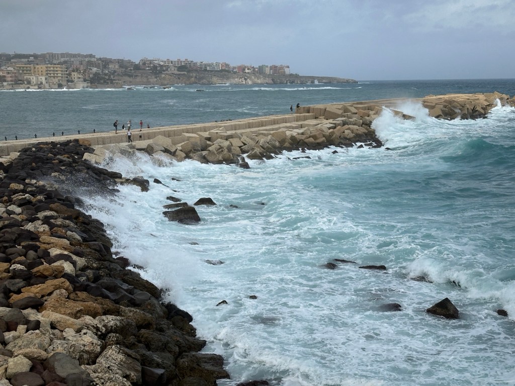 Leider hatte uns das schöne Wetter verlassen, was zunächst nicht so viel ausmachte. Dieter musste mal wieder arbeiten, und auch das Wohnmobil hatte es nötig. Unter der Markise machte der leichte Regen nicht viel aus, man saß gemütlich darunter. Abends gab es dann ein heftiges Gewitter. Der Samstag startete ähnlich nass wie der Freitag aufgehört hatte, so dass wir erst einmal abwarten mussten. Gegen Mittag hörte der Regen auf, und wir starteten mit den Rädern zu einem Ausflug nach Noto, das rund 15 km entfernt ist. Unterwegs machten wir kurz halt am Lungomare von Avola, wo es eine runde Seebrücke gab.