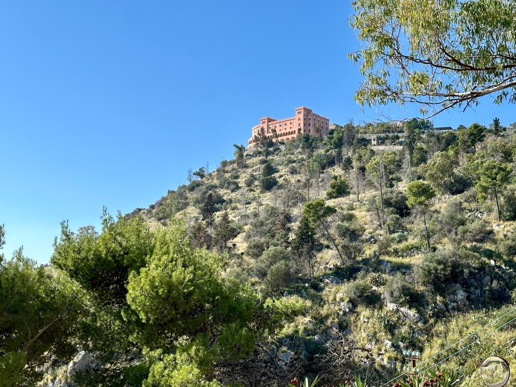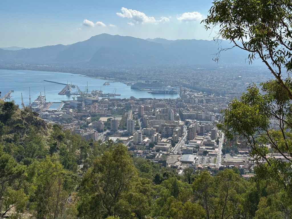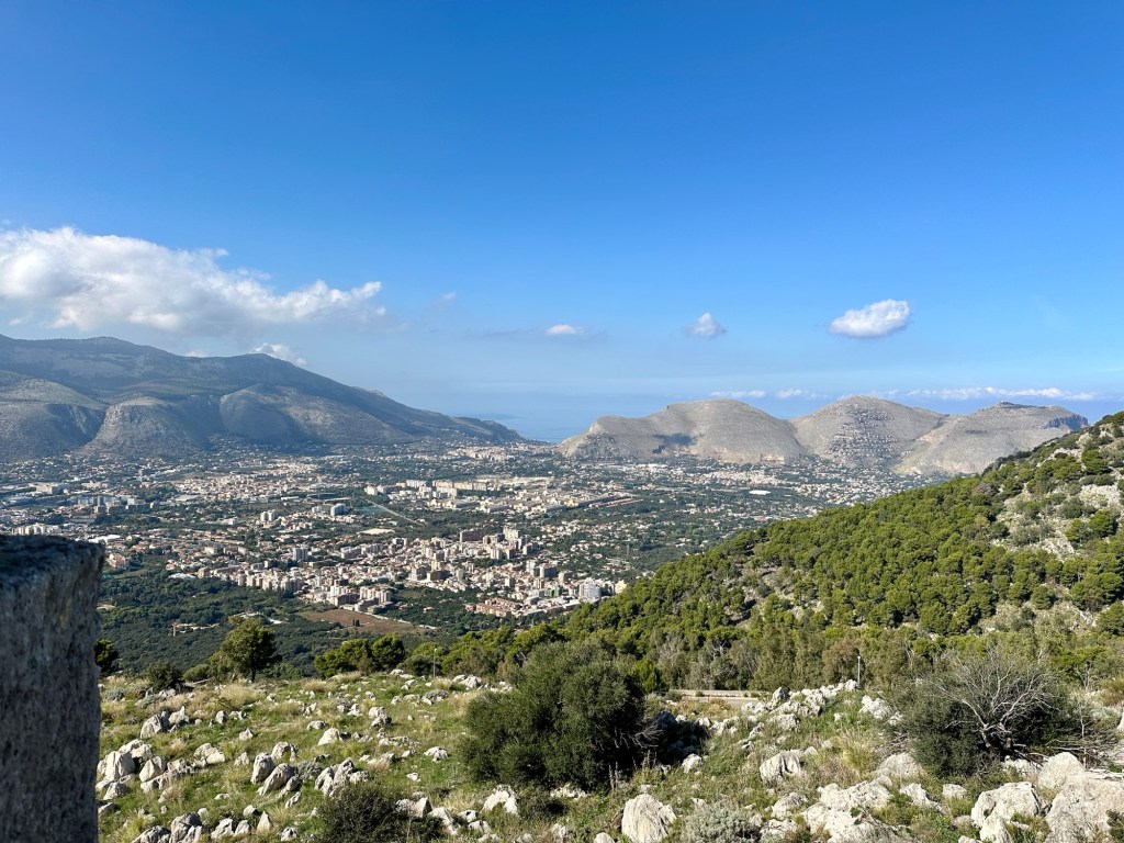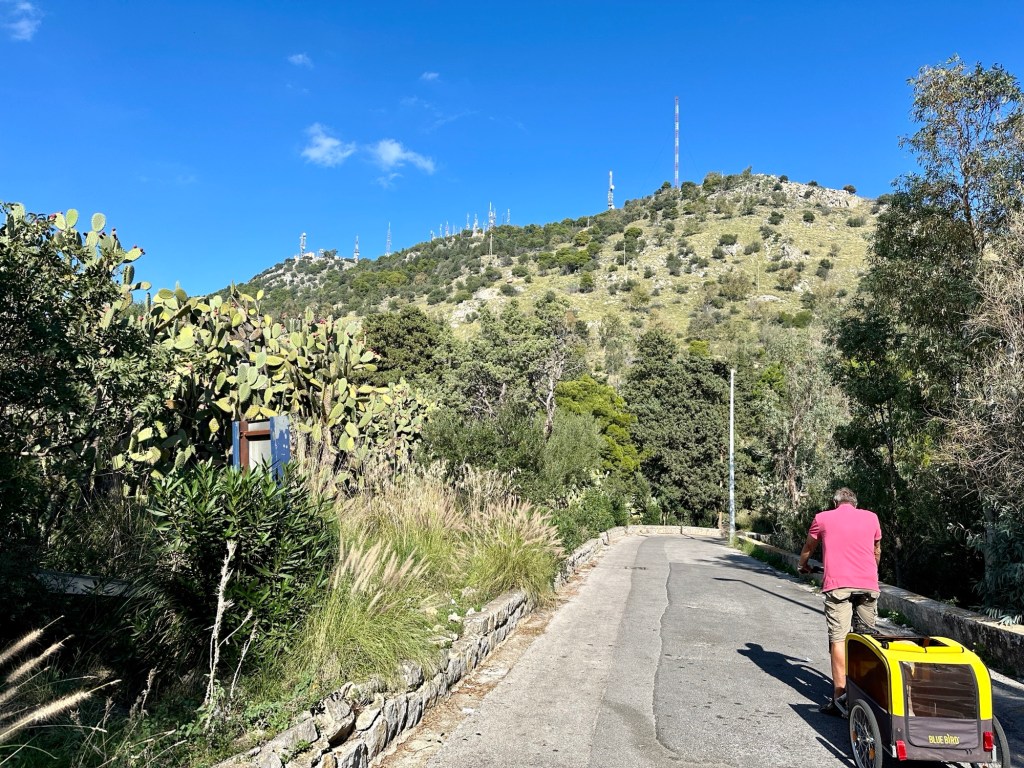 Es gibt zwei Wege hinauf: den alten Pilgerweg, der relativ steil bergauf geht und daher anstrengend ist, und es gibt die Straße, die bis circa 100 m unterhalb des Gipfels verläuft. Daher war klar, dass wir nicht laufen würden, sondern mit den eBikes fahren würden. Und ich muss gestehen, trotz eBike war es ganz schön anstrengend, immerhin ging es circa 6 km in Serpentinen den Berg hoch, rund 500 Höhenmeter mussten wir überwinden. Am Ende gingen wir noch ein Stück zu Fuß weiter. Der Blick auf Palermo und das Hinterland war fantastisch, da hat sich die Anstrengung auch auf jeden Fall gelohnt. es war etwas diesig. Daher geben die Bilder nicht die volle Schönheit des Ausblicks wieder.