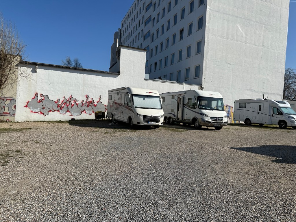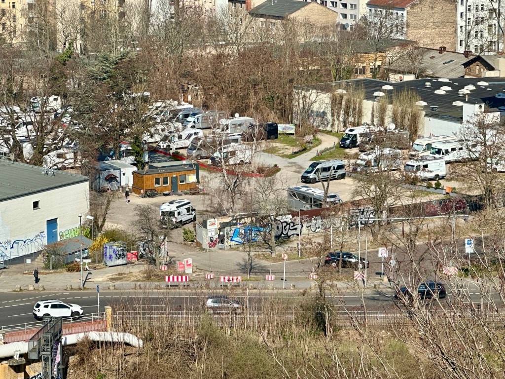 Übernachtet haben wir im Wedding, auf der Wohnmobil-Oase Berlin, nahe dem Gesundbrunnenzentrum. Das ist ein ganz zentraler Ort, von dem man mit den Öffis problemlos in die City kommt, wenn denn die BVG nicht gestreikt hätte. Also Fahrräder runter, Hund in den Hänger und damit nach Kreuzbeg, immerhin auch rund 8 km durch die Stadt, geradelt.
