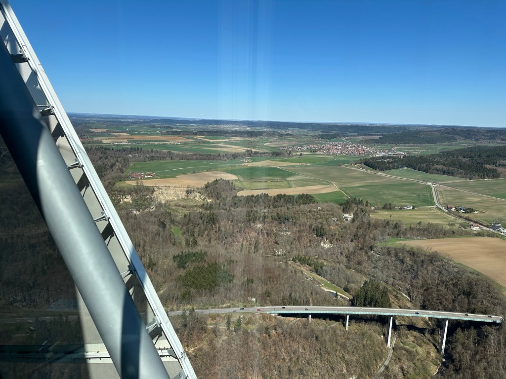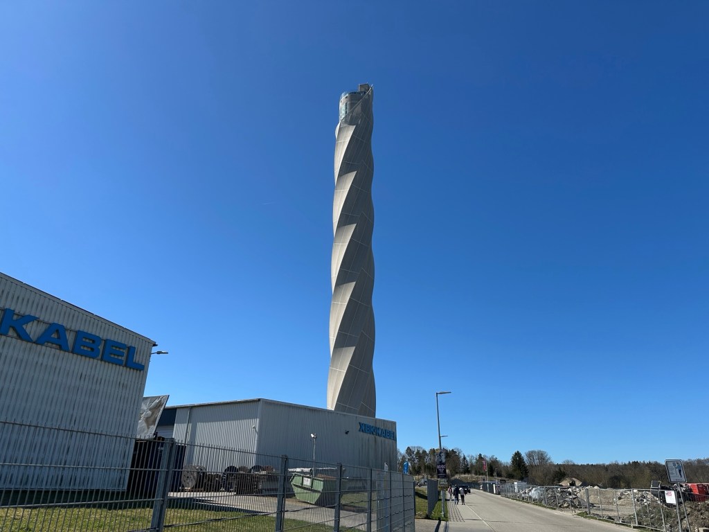 Gut gelaunt und entspannt fuhren wir weiter. Wir wollten alte Freunde, die auf der schwäbischen Alb, die ganz in der Nähe leben, besuchen. Auf dem Weg dahin besuchten wir den Testturm von ThyssenKrupp für Aufzüge, der in der Nähe von Rottweil in der Höhe ragt. Jedes Mal, wenn wir von Tuttlingen wieder gefahren sind, haben wir den Turm gesehen, aber es war nie Zeit ihn zu besichtigen, zumal er auch nur am Wochenende für Besucher geöffnet ist.