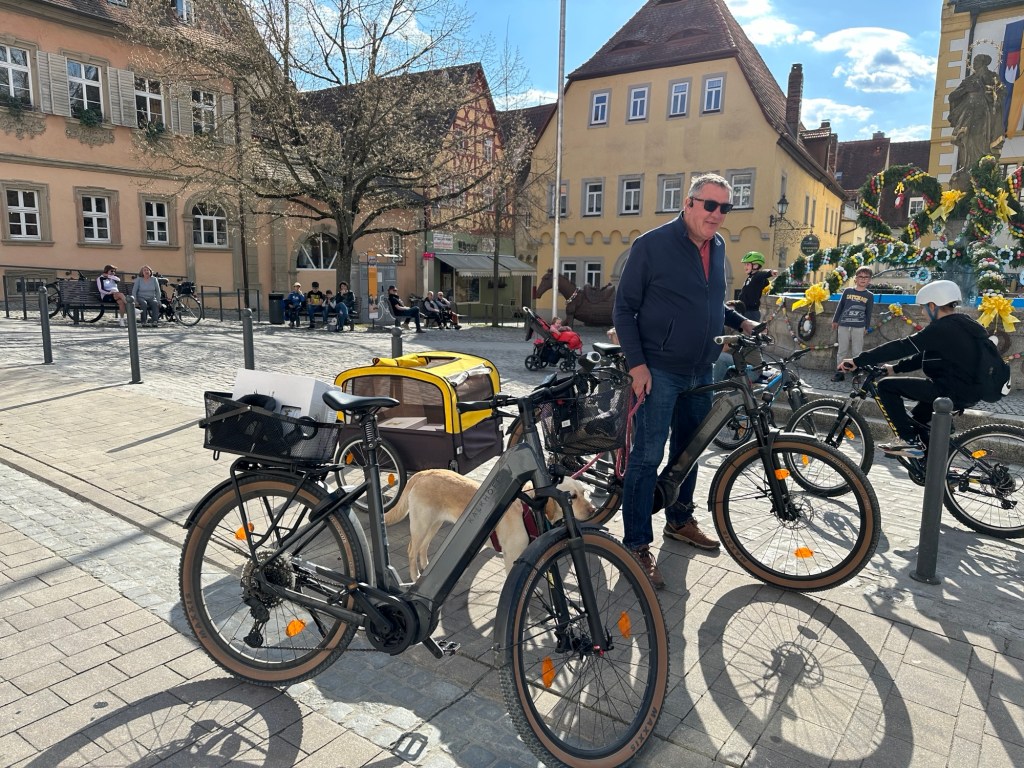 Am Tag darauf machten wir wir es es uns bei bestem Wetter am Wohnmobil gemütlich, Dieter hatte noch eine Videokonferenz zu absolvieren und ich nutzte die Gelegenheit, um einen Spaziergang mit Andra zu unternehmen. Am Nachmittag machten wir uns dann nach Volkach auf, um ein wenig des des guten Weines an Bord zu nehmen. Andra musste laufen, denn ihr Anhänger wurde für den Weintransport missbraucht.