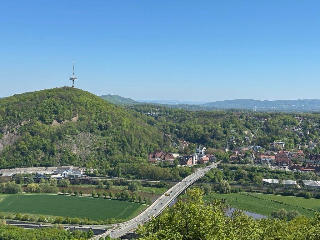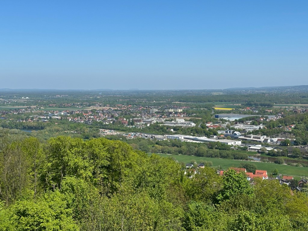 Es ist ja eine Binsenweisheit, dass wenn man irgendwo hoch fährt oder geht, dass man runter schauen kann. Auch in diesem Fall bewahrheitete sich dieser Spruch. Nach weiteren 3 km, und dieses Mal ging es richtig bergauf, hatten wir unser Ziel erreicht und standen auf der Aussichtsplattform des Denkmals. Und wir wurden nicht enttäuscht, wir hatten einen wunderbaren Blick über die Porta Westfalica und das Tal der Weser.
