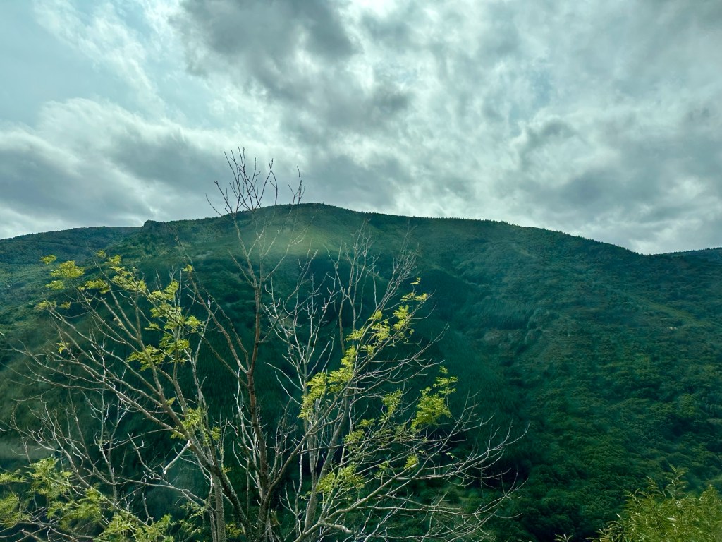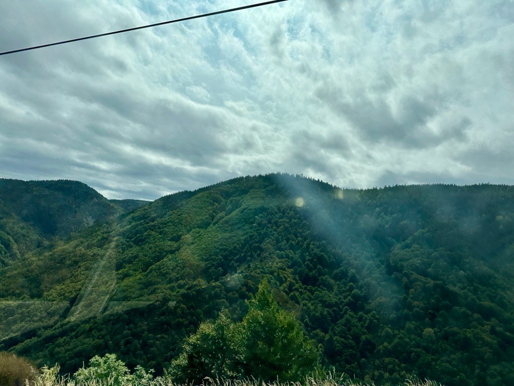 Die Fahrt an die Ardèche war auf jeden Fall sehr spektakulär. Denn sie führte durch das Zentralmassiv, einem großen Mittelgebirge mitten in Südfrankreich. Der höchste Berg ist knapp 1900 m hoch. Wir überwanden drei Pässe, jeweils zwischen 1100 und 1300 m hoch. Insbesondere die Abfahrt ins Tal der Ardèche bot beeindruckende Ausblicke. Hier ein paar Fotos, die fast alle während der Fahrt aus dem Auto aufgenommen wurden.